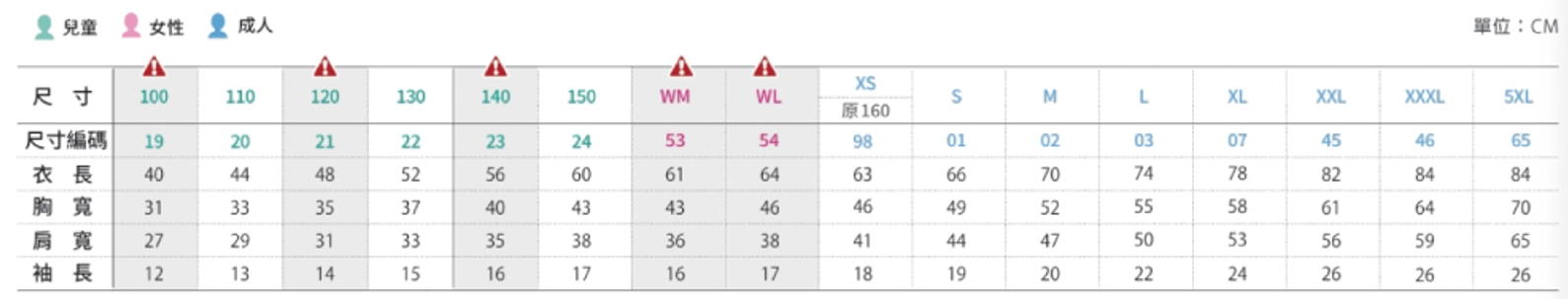 | 尺寸 | 100, 110, 120, 130, 140, 150, WL, WM, XS, S, M, L, XL, 2XL, 3XL, 5XL |