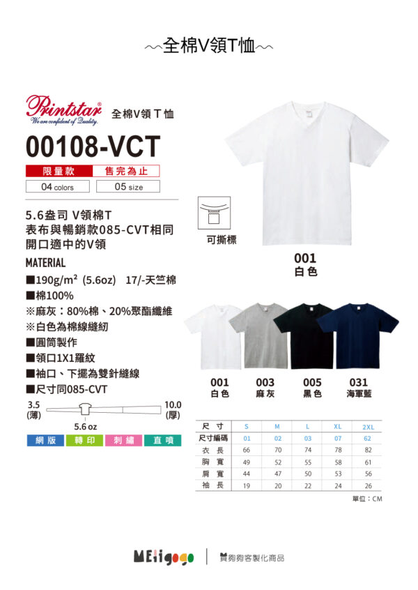 Printstar 全棉V領 T-Shirt 00108_VCT