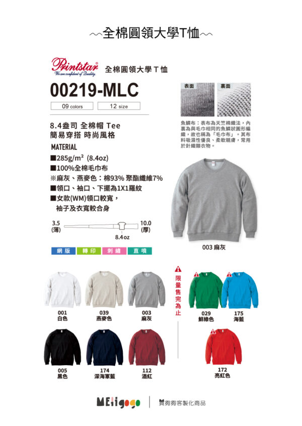 Printstar 00346-AFC-重磅T/C內刷毛圓領大學T恤